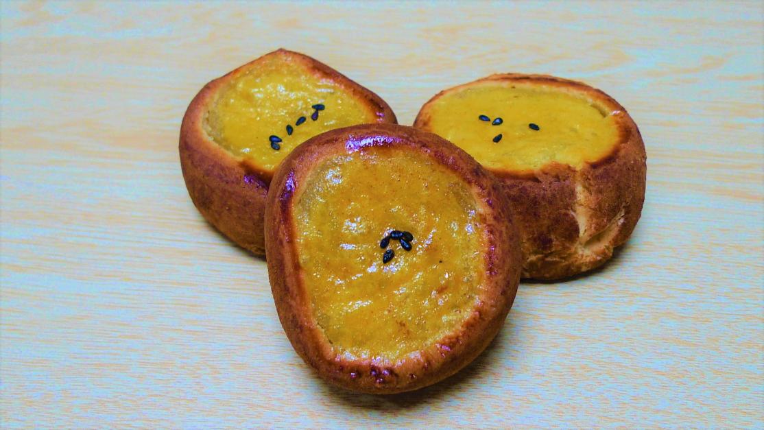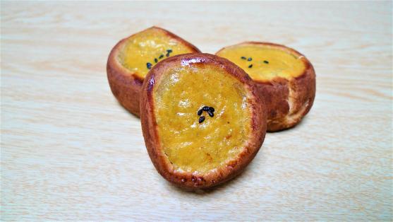 福寿芋日本一と名高いさつまいも鳴戸金時を使用したお菓子。練乳バター入りさつまいも餡にニッキをまぶし焼き上げました。和風スイートポテトのお饅頭。 230円(税込)